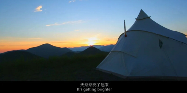 天漸漸亮了起來,越過重重山脈的陽光 映紅了云層,照亮了山谷,催醒了沉睡的動(dòng)物,一頂頂帳篷像隆起的蘑菇 生⻓在云端之上。